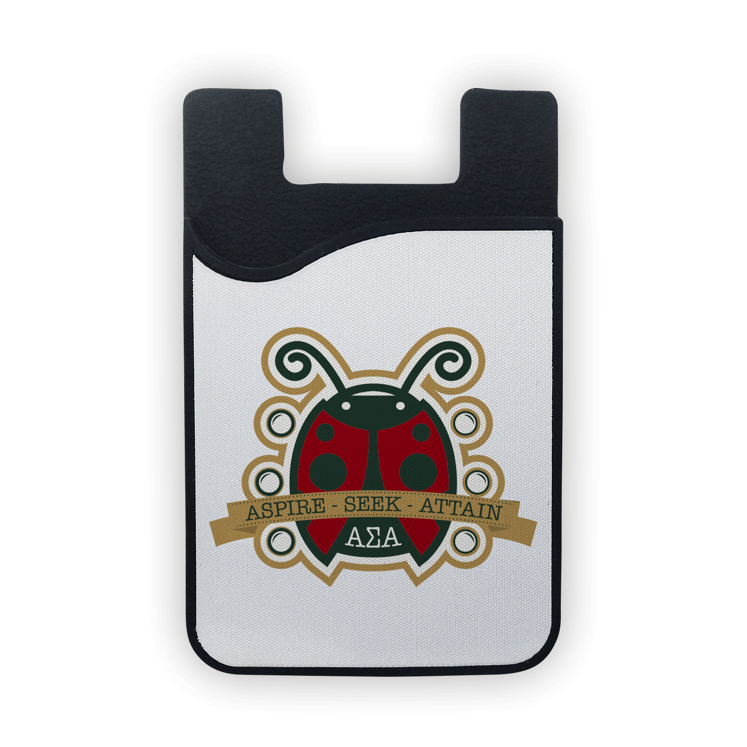 Specs: Black Silicone Phone Wallet. Size: 3-3/4″ x 2-1/4″ x 1/8″. Features: Fits Credit Cards, IDs, or cash. Design is printed on removable microfiber screen cleaner.