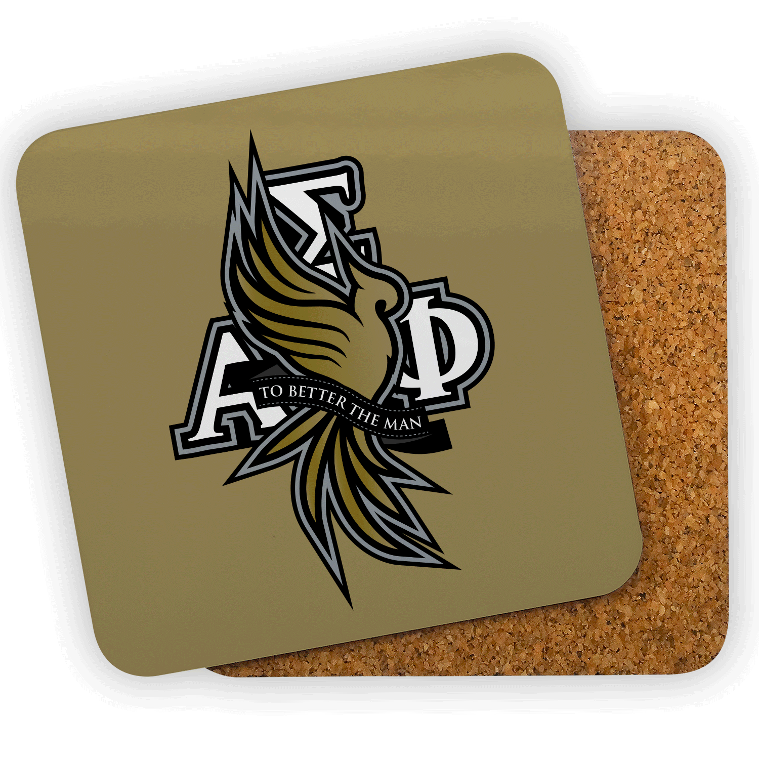Specs: 3.75” square coaster with rounded corners, cork backing