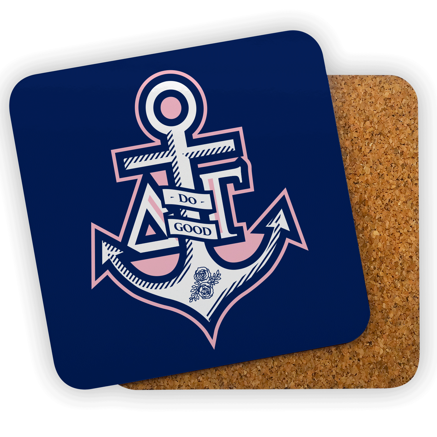 Specs: 3.75” square coaster with rounded corners, cork backing