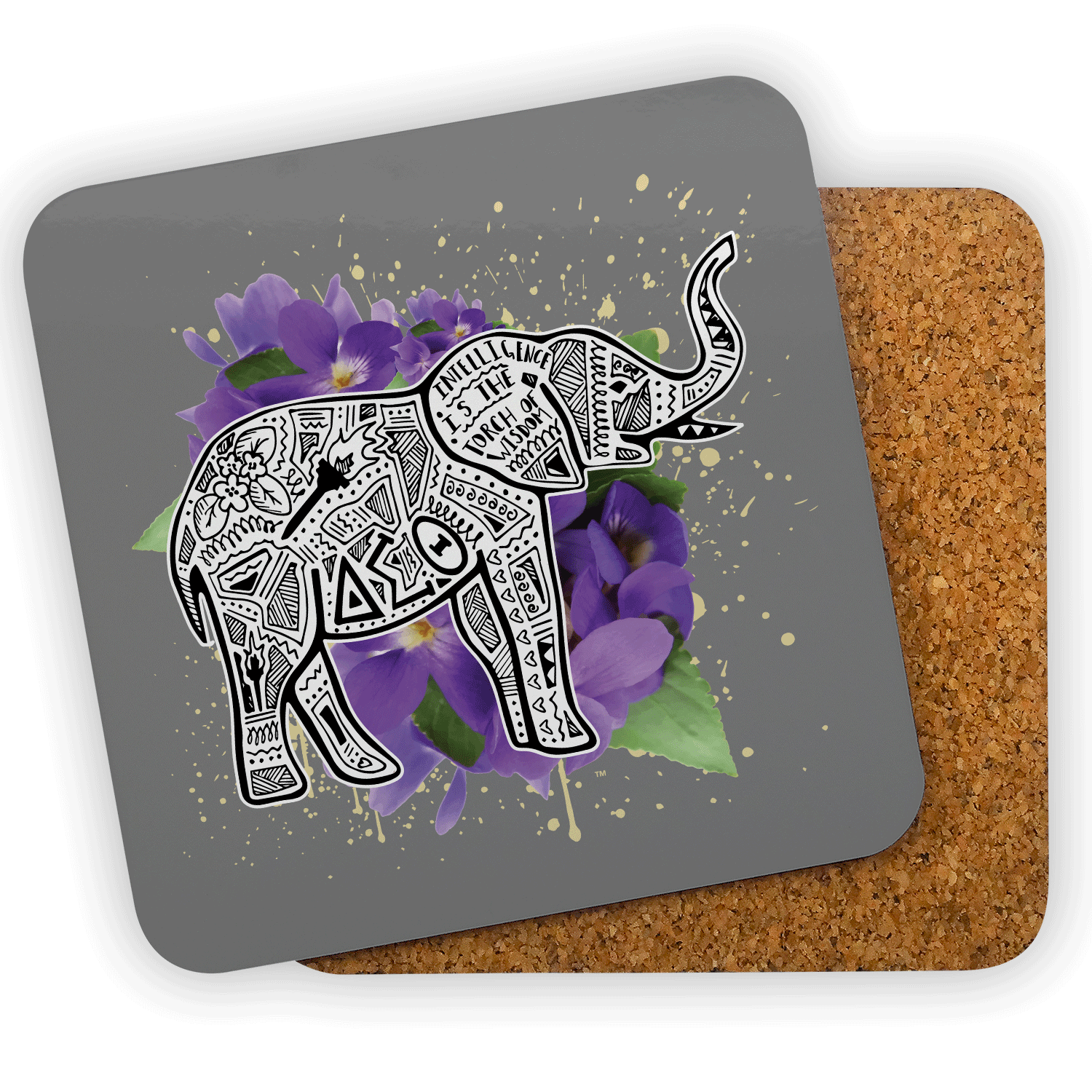 Specs: 3.75” square coaster with rounded corners, cork backing