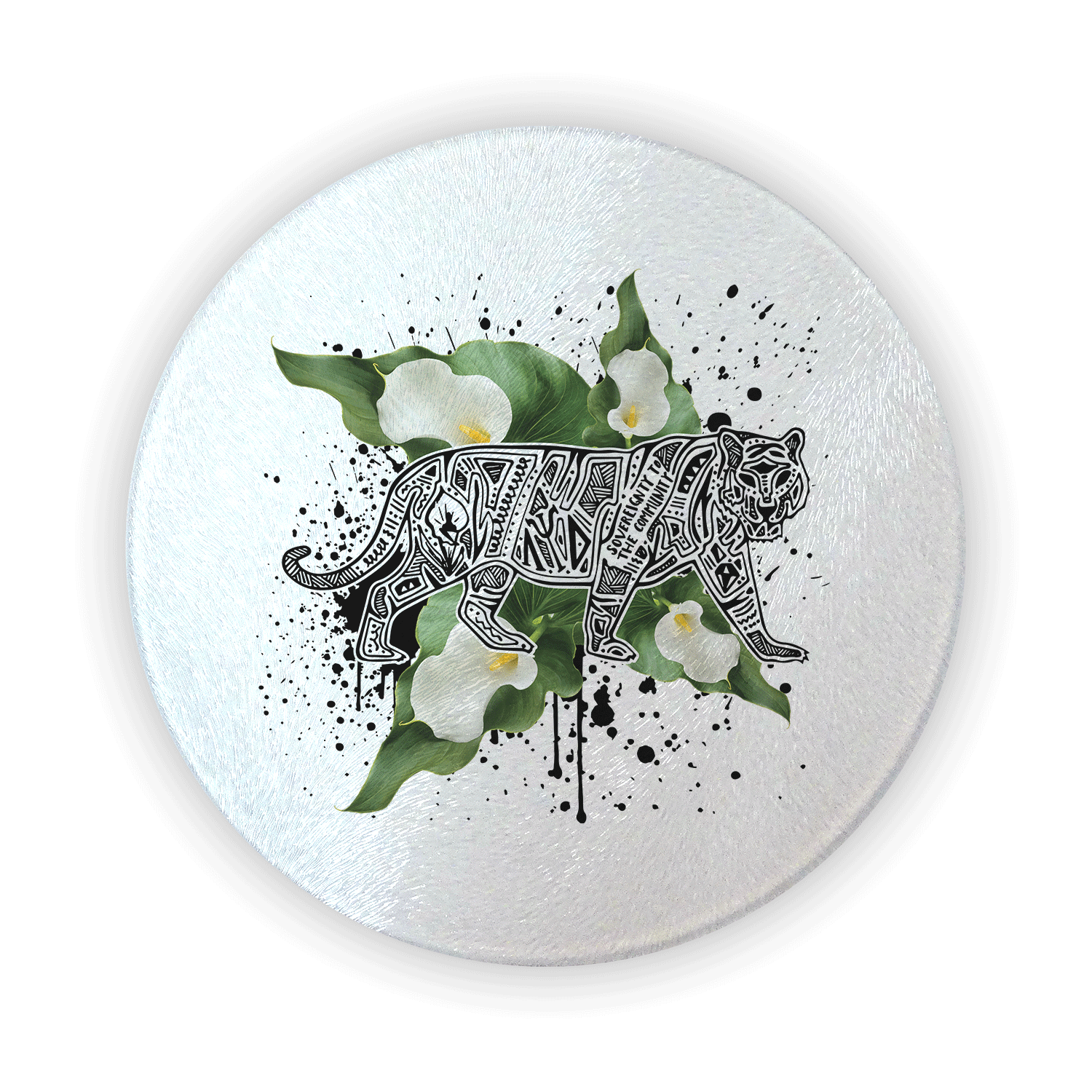 Specs: 12″ round tempered glass Features: Small rubber feet on bottom that prevent sliding