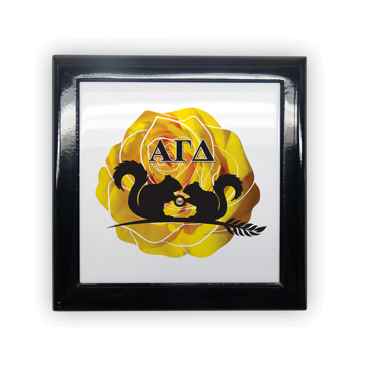Specs: 5.5” square and 2.3” deep; black gloss wood with hinged lid