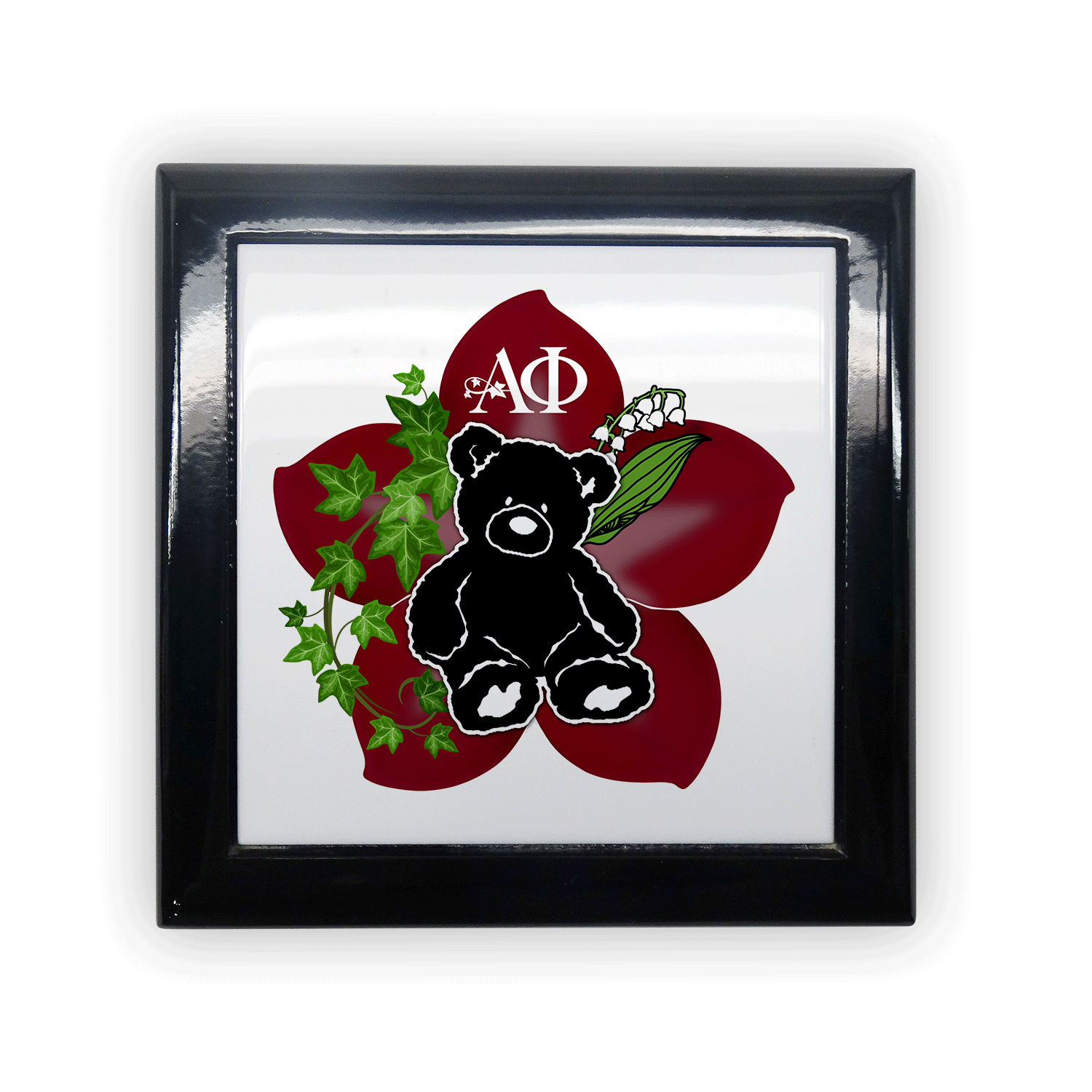 Specs: 5.5” square and 2.3” deep; black gloss wood with hinged lid