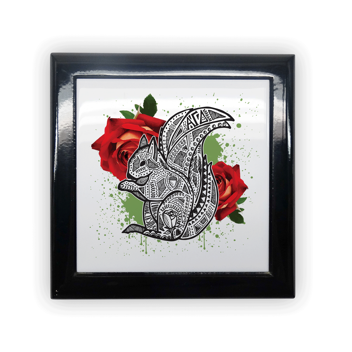 Specs: 5.5” square and 2.3” deep; black gloss wood with hinged lid