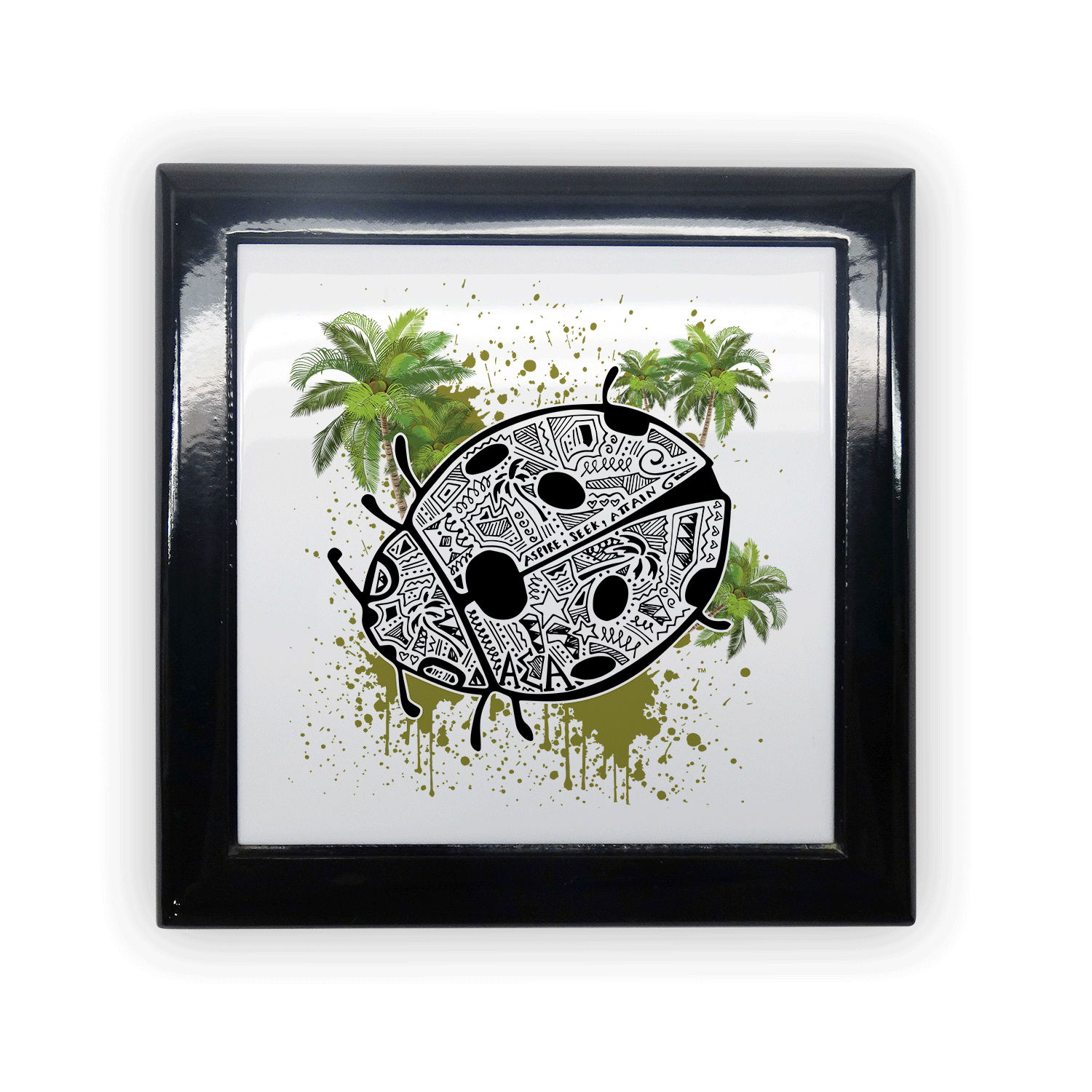 Specs: 5.5” square and 2.3” deep; black gloss wood with hinged lid