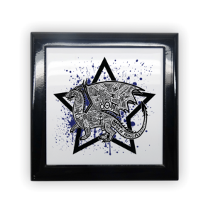 Specs: 5.5” square and 2.3” deep; black gloss wood with hinged lid