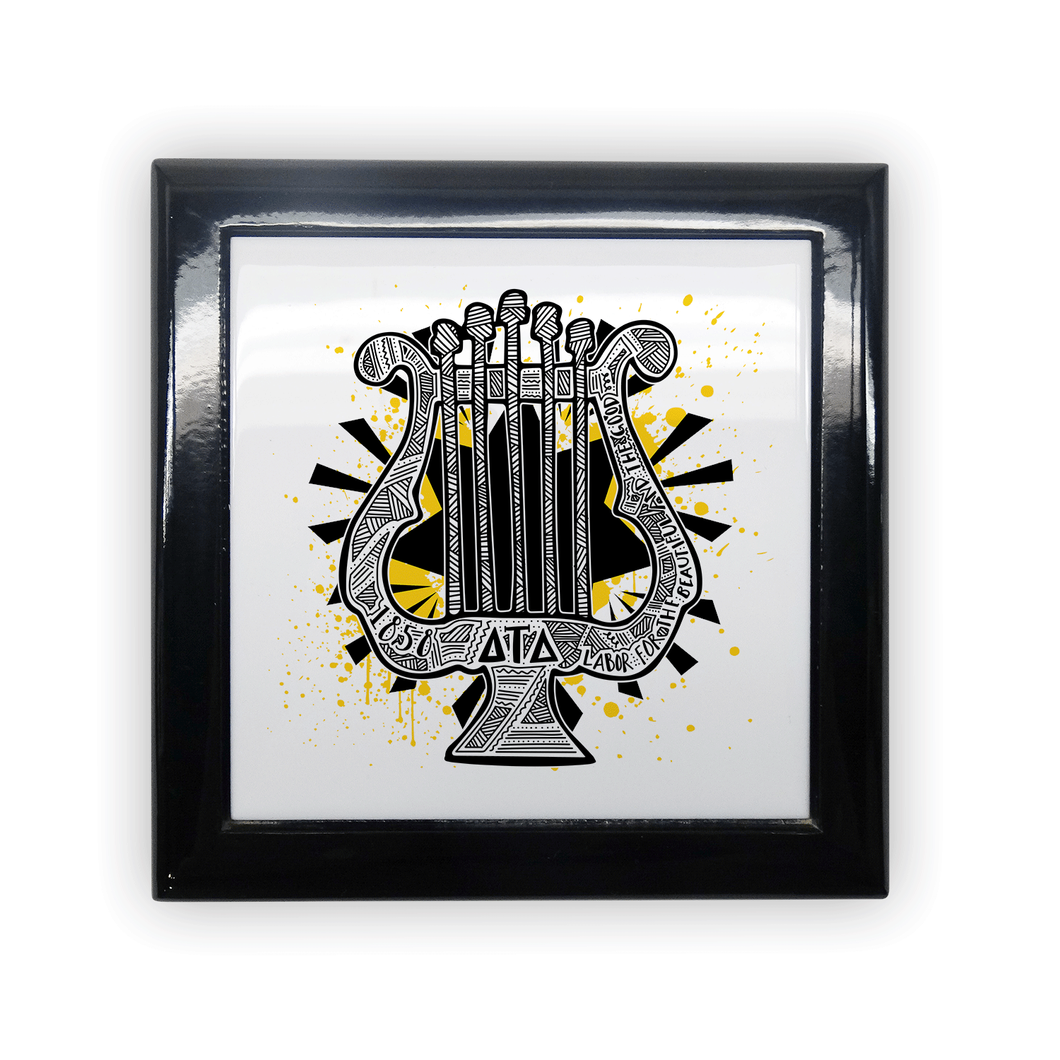 Specs: 5.5” square and 2.3” deep; black gloss wood with hinged lid
