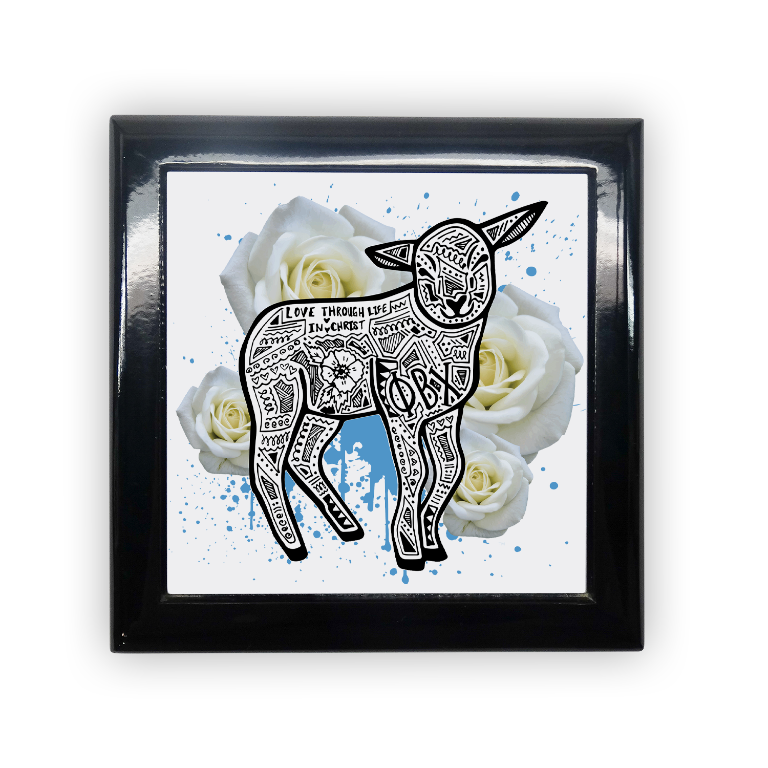 Specs: 5.5” square and 2.3” deep; black gloss wood with hinged lid