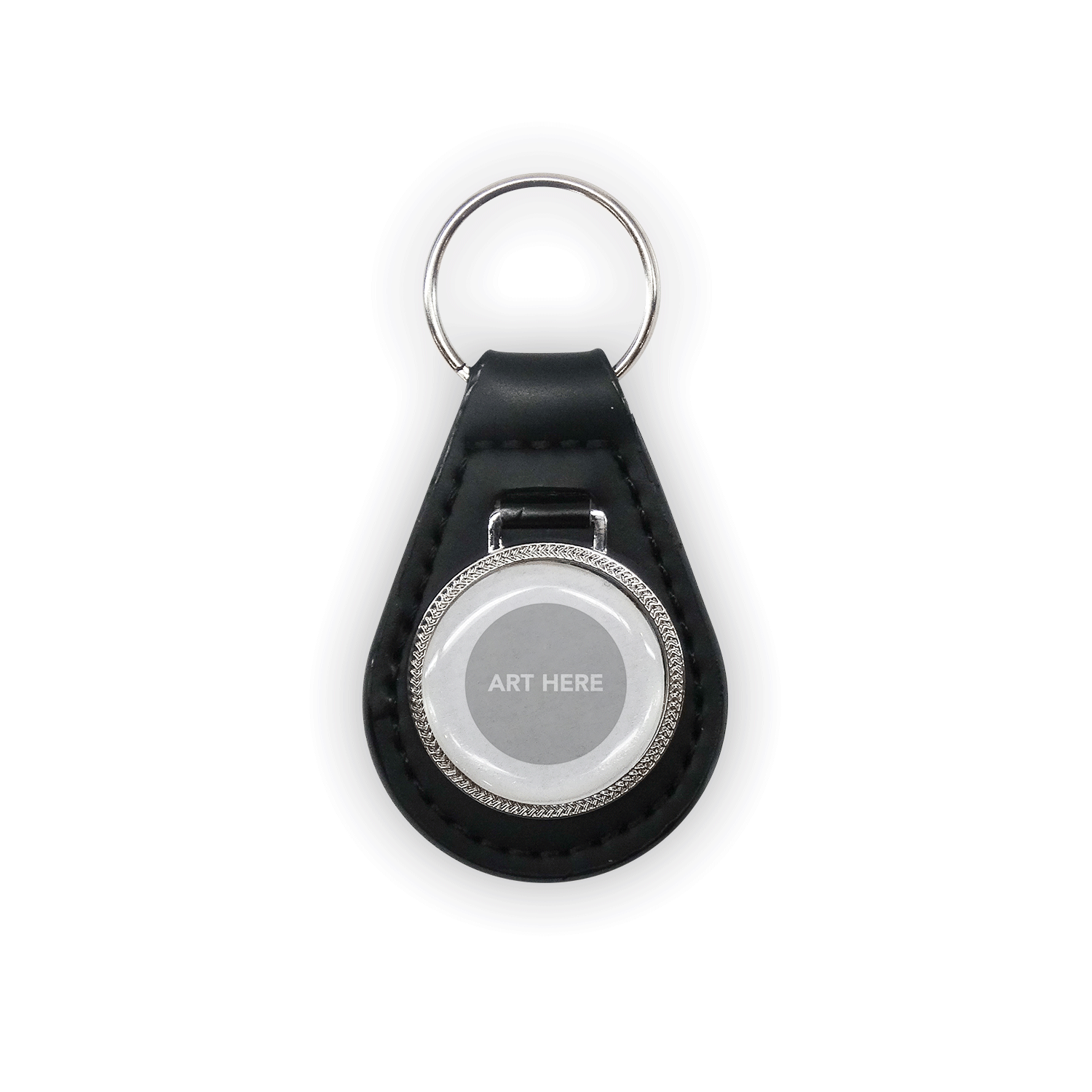 Specs: Fob made of quality black faux leather with 1” diameter image Features: Graphic protected by dome cover