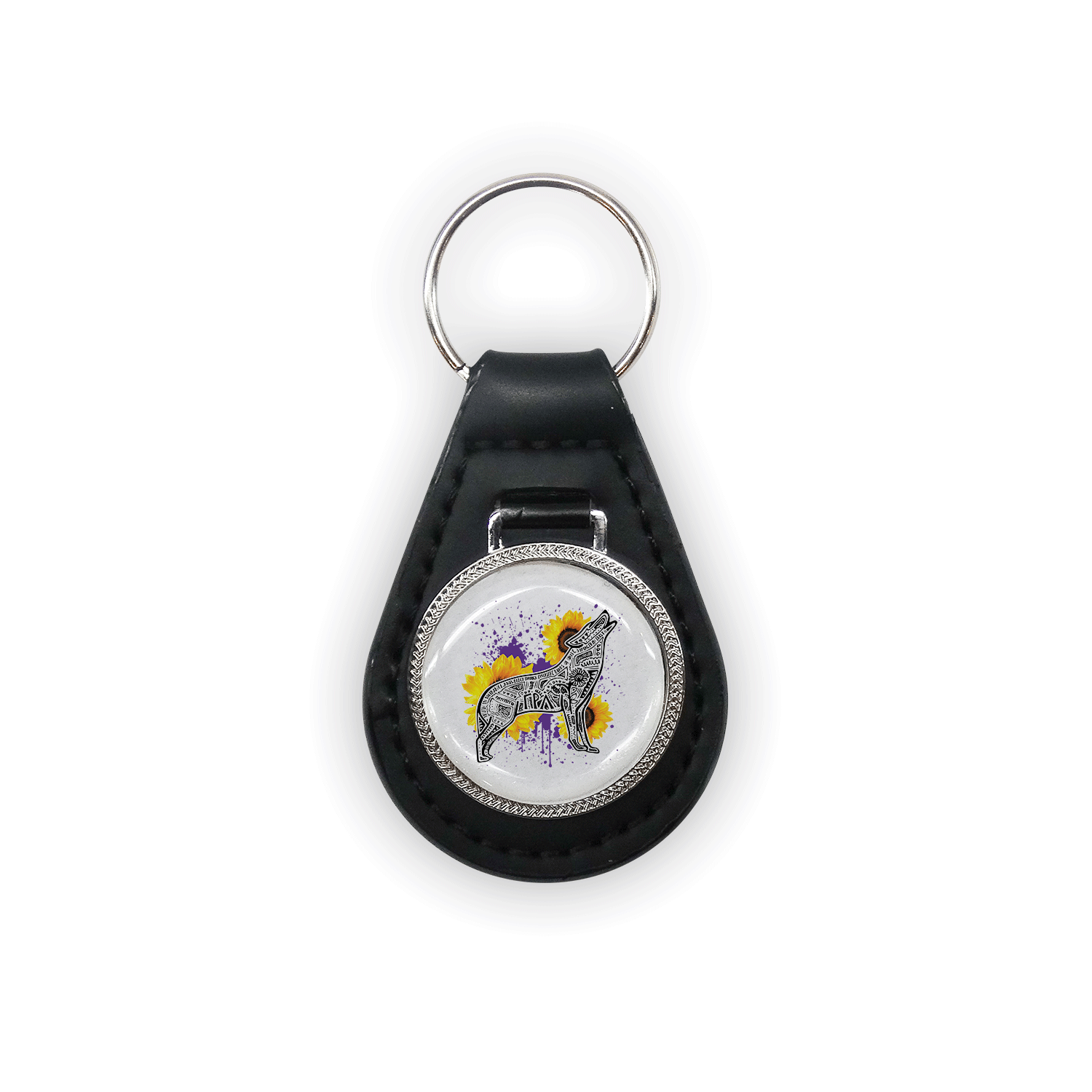 Specs: Fob made of quality black faux leather with 1” diameter image Features: Graphic protected by dome cover