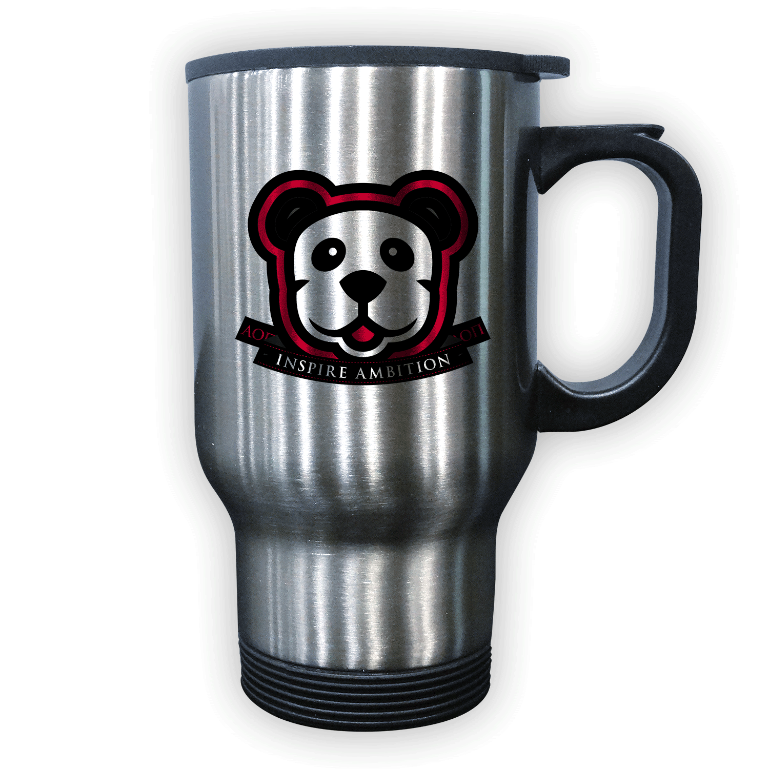 Specs: 14 oz. stainless steel travel mug with resilient plastic lid, handle, and base