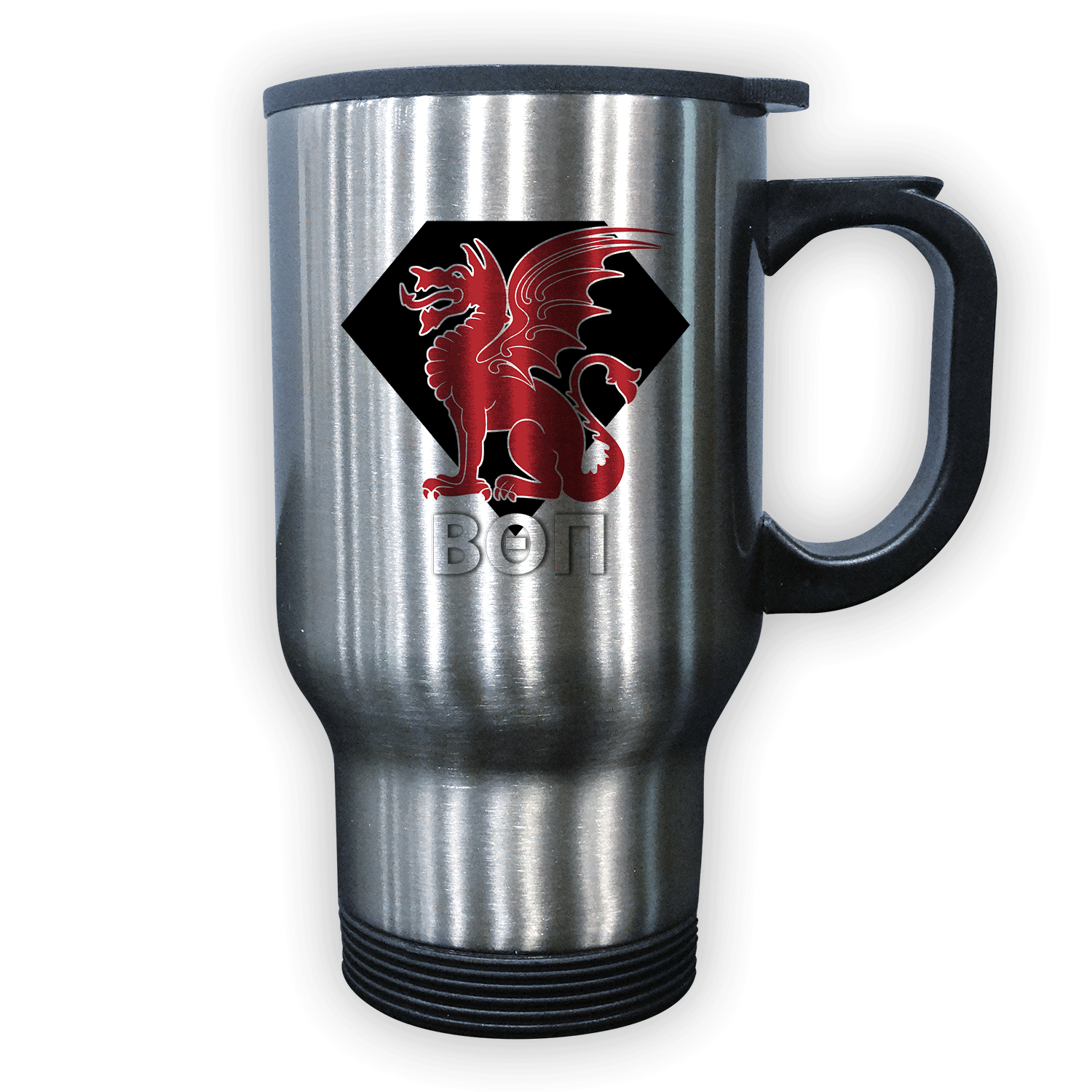 Specs: 14 oz. stainless steel travel mug with resilient plastic lid, handle, and base
