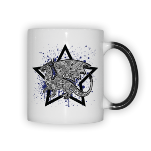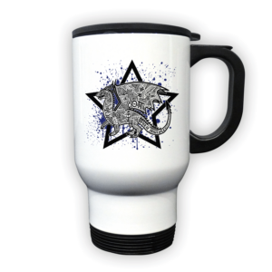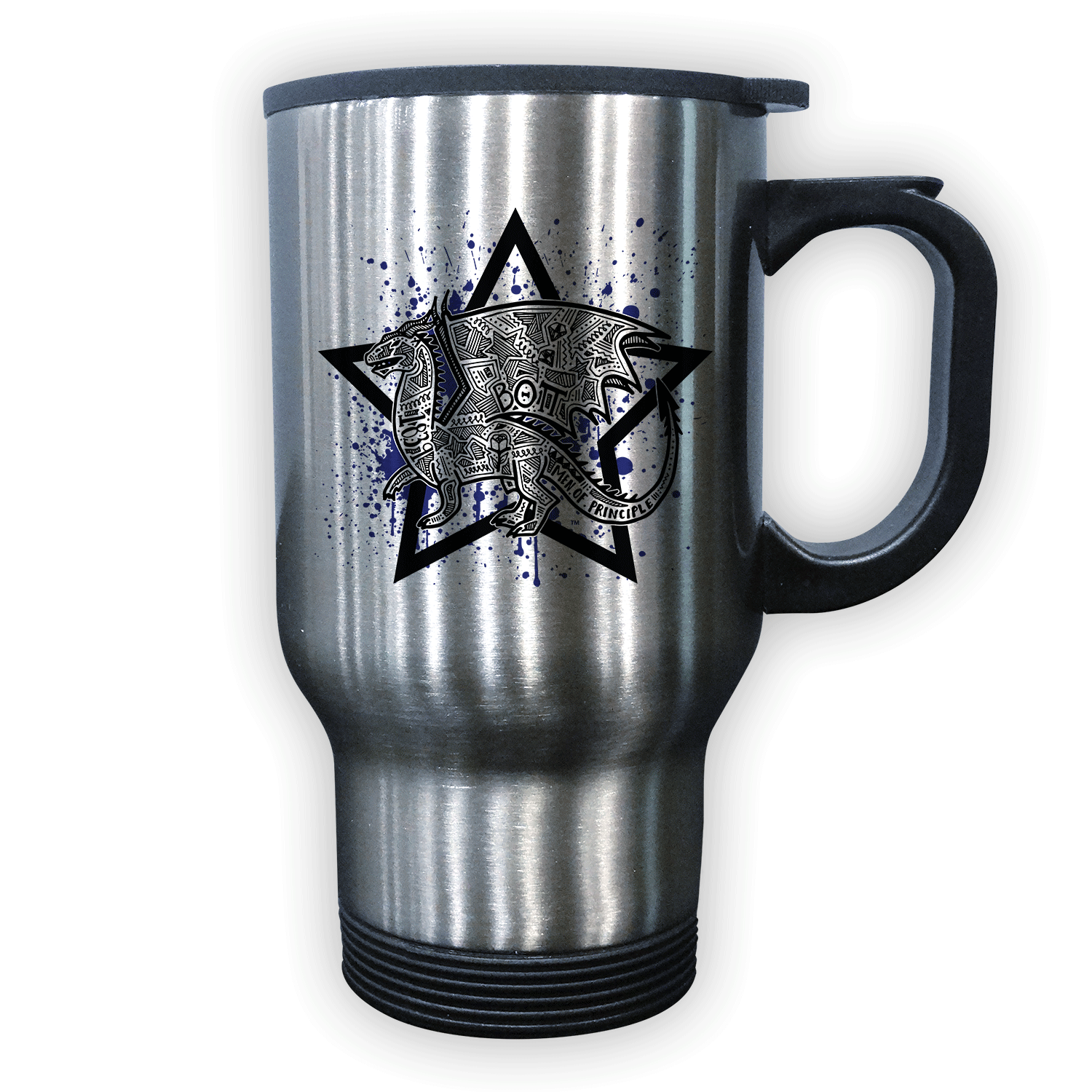 Specs: 14 oz. stainless steel travel mug with resilient plastic lid, handle, and base