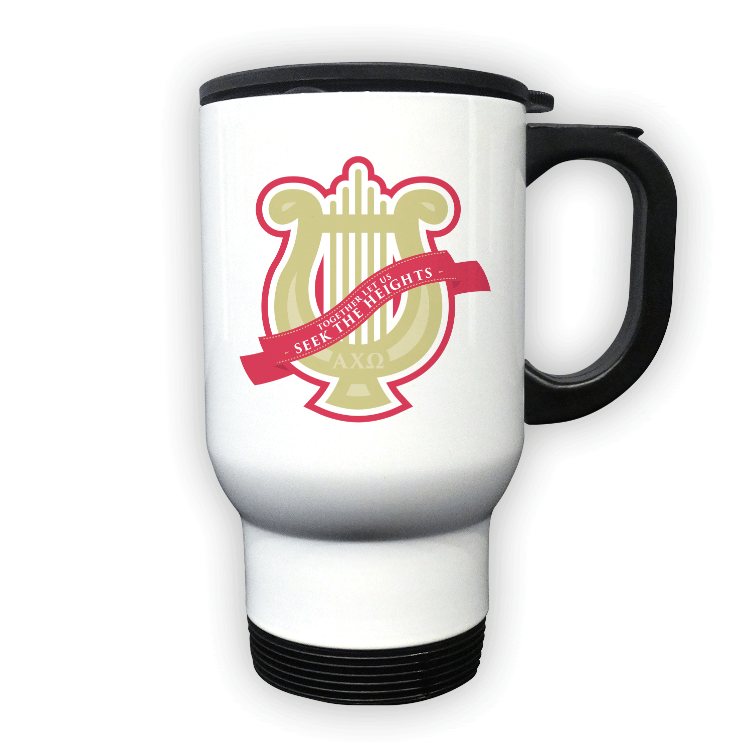 Specs: 14 oz. white travel mug with a stainless steel interior and resilient plastic lid, handle, and base