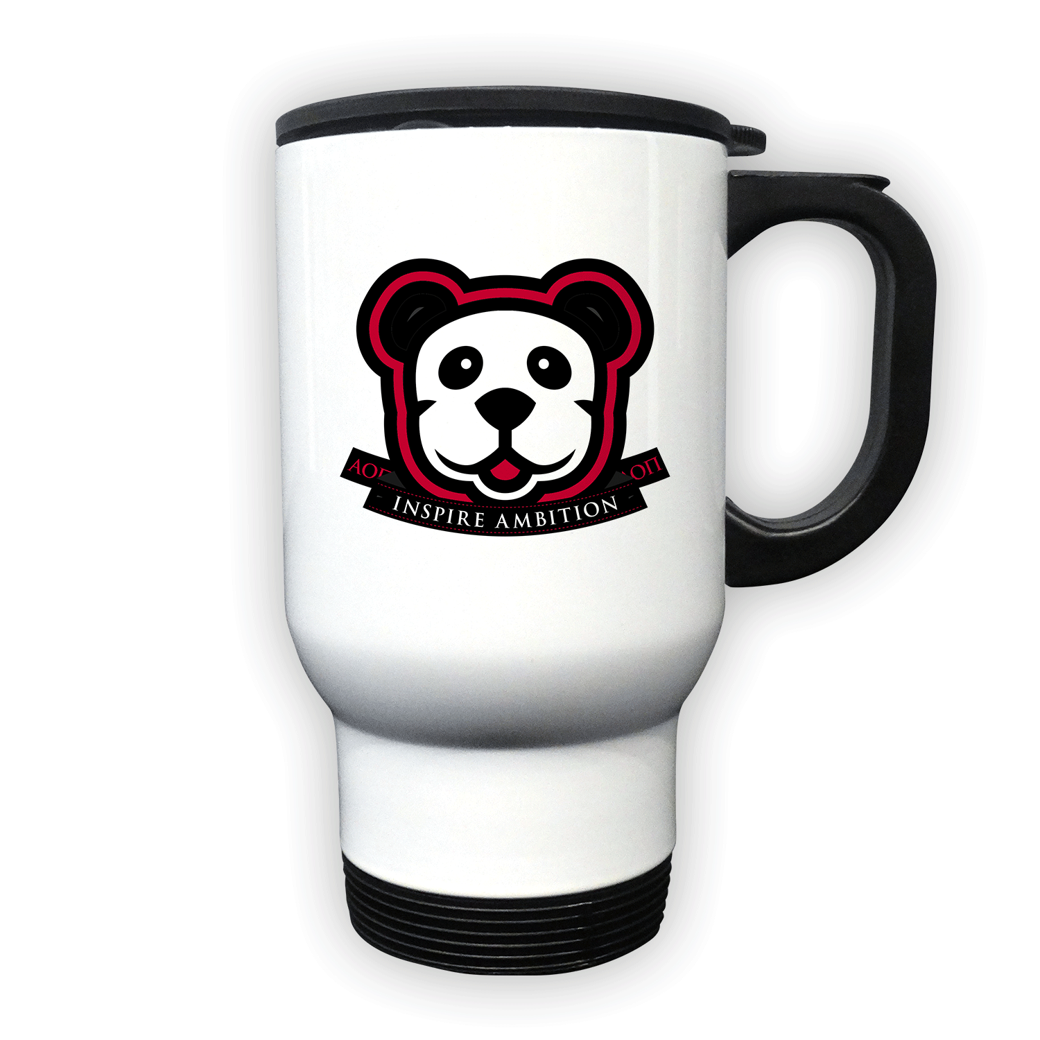 Specs: 14 oz. white travel mug with a stainless steel interior and resilient plastic lid, handle, and base