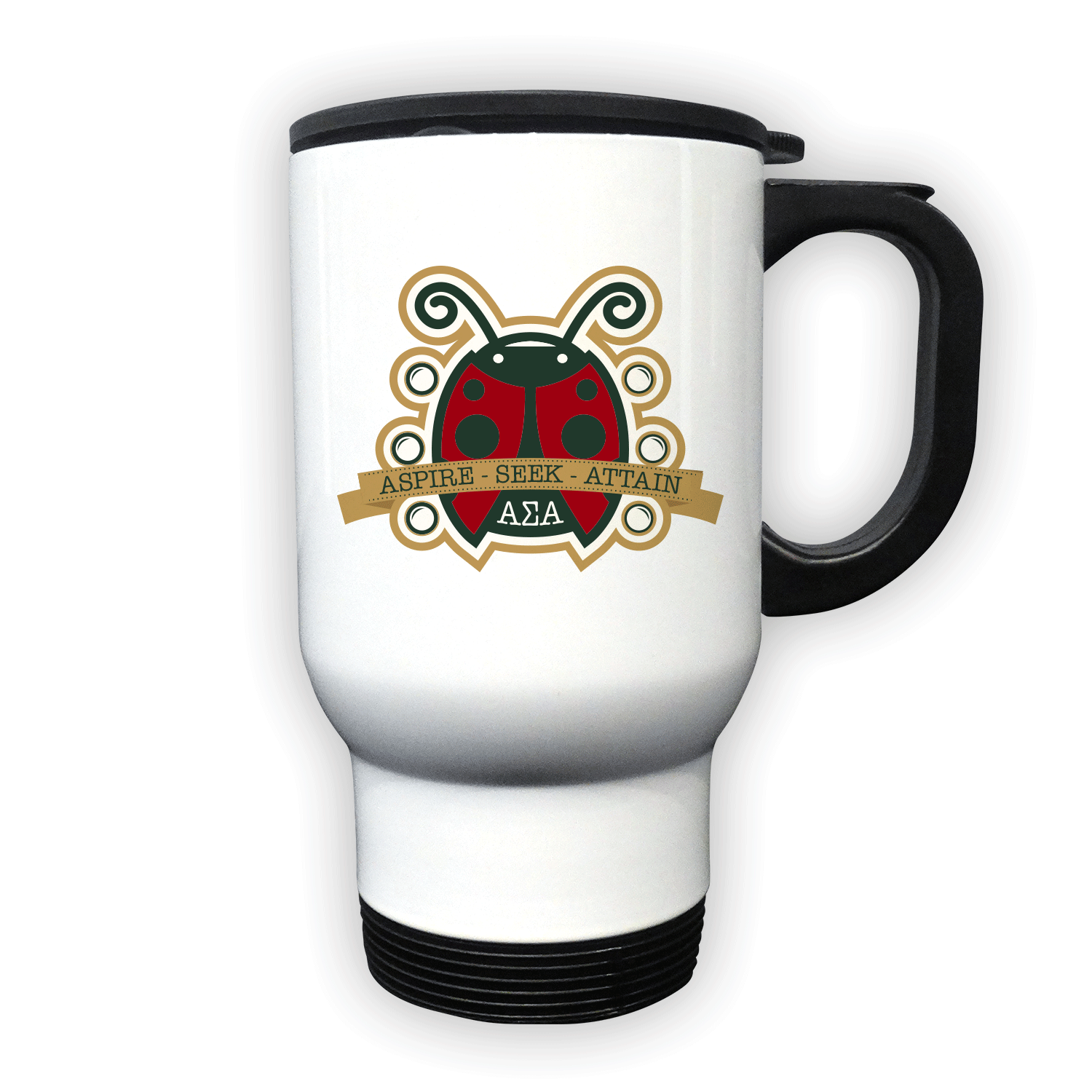Specs: 14 oz. white travel mug with a stainless steel interior and resilient plastic lid, handle, and base Features: Fits standard vehicle drink holder, hand wash only