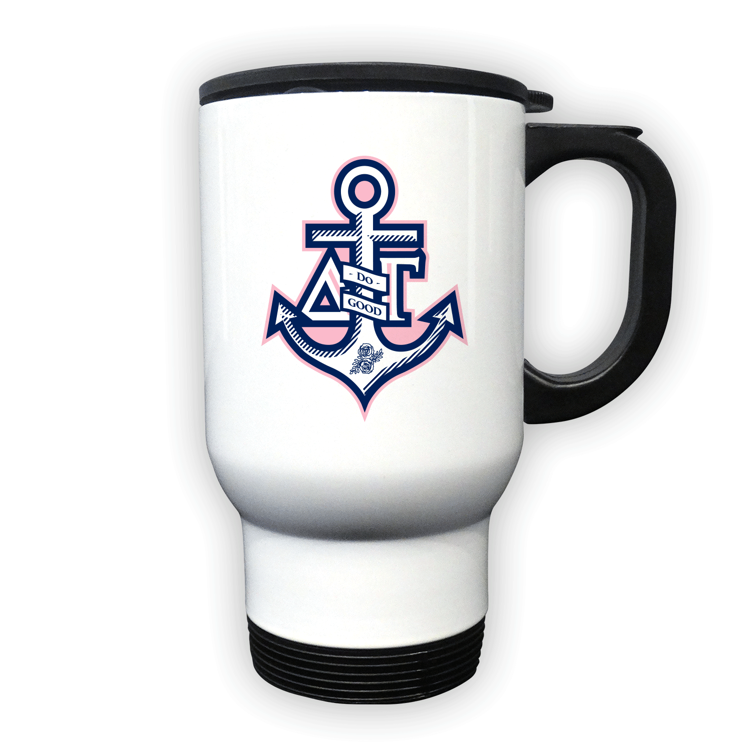 Specs: 14 oz. white travel mug with a stainless steel interior and resilient plastic lid, handle, and base