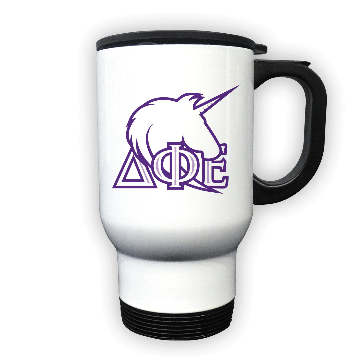 Specs: 14 oz. white travel mug with a stainless steel interior and resilient plastic lid, handle, and base