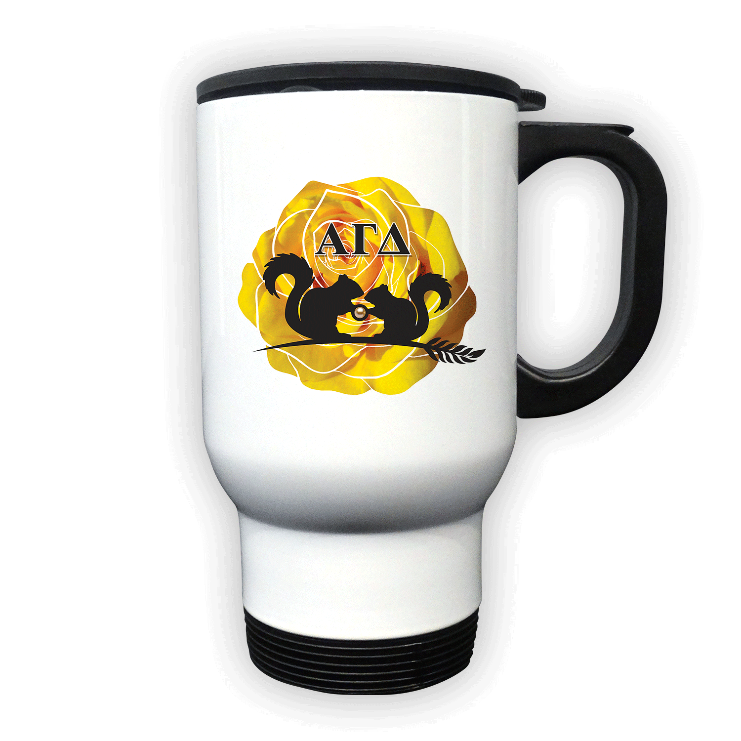 Specs: 14 oz. white travel mug with a stainless steel interior and resilient plastic lid, handle, and base