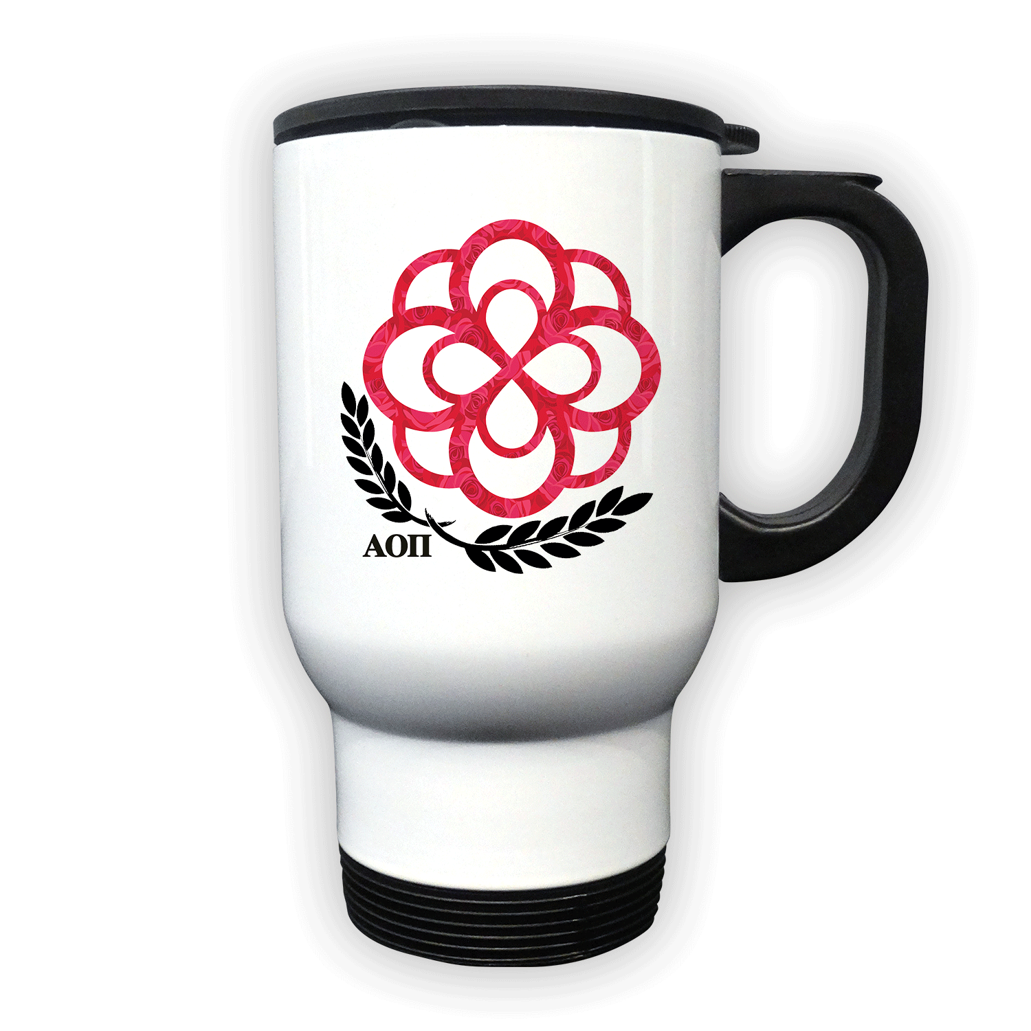 Specs: 14 oz. white travel mug with a stainless steel interior and resilient plastic lid, handle, and base