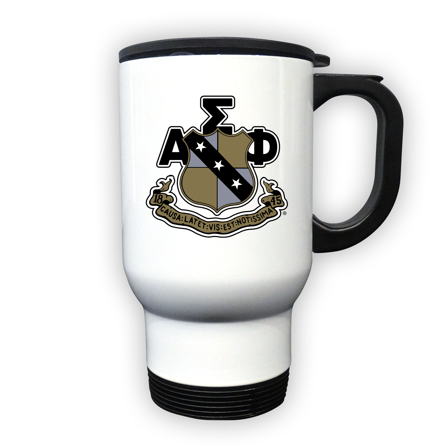 Specs: 14 oz. white travel mug with a stainless steel interior and resilient plastic lid, handle, and base