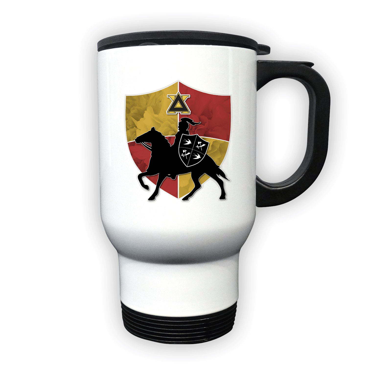 Specs: 14 oz. white travel mug with a stainless steel interior and resilient plastic lid, handle, and base