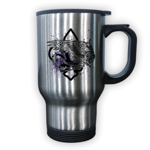 Specs: 14 oz. white travel mug with a stainless steel interior and resilient plastic lid, handle, and base Features: Fits standard vehicle drink holder, hand wash only