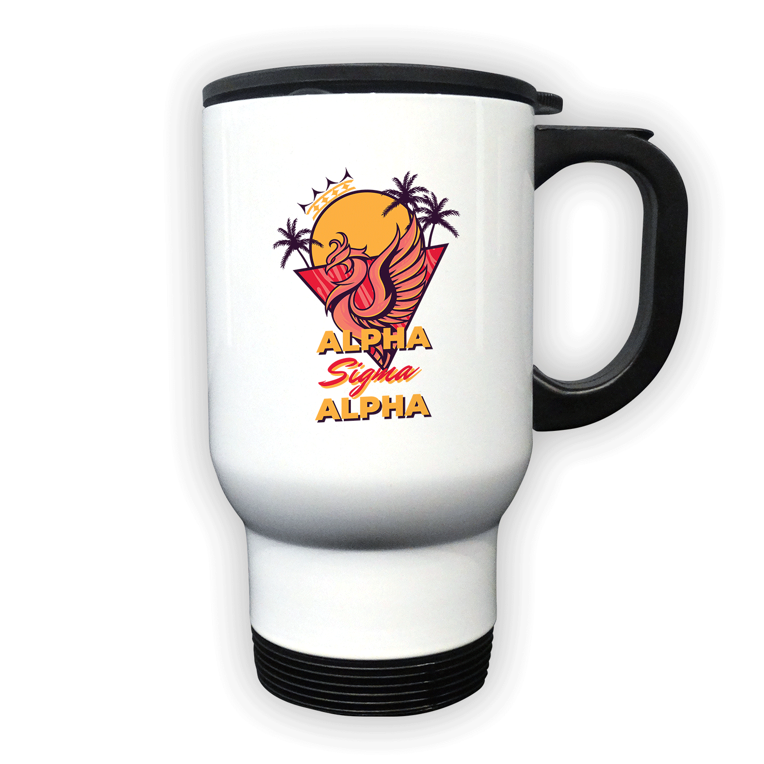 Specs: 14 oz. white travel mug with a stainless steel interior and resilient plastic lid, handle, and base Features: Fits standard vehicle drink holder, hand wash only