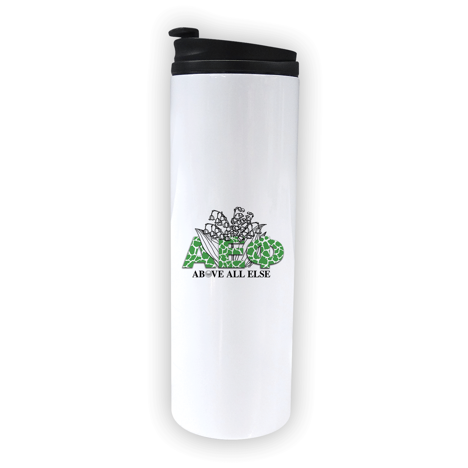 Specs: Graphic is printed on a white 16 oz. stainless steel tumbler that has removable resilient plastic lid.