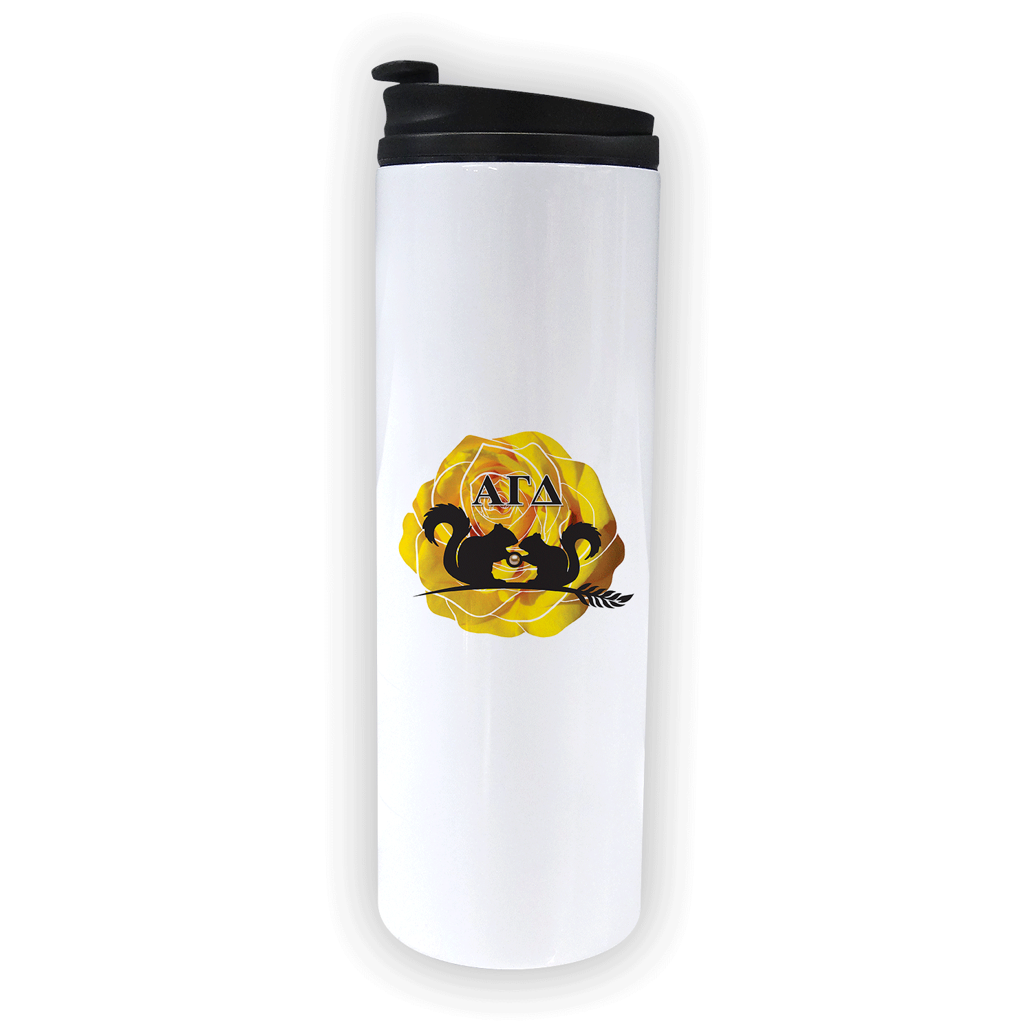 Specs: Graphic is printed on a white 16 oz. stainless steel tumbler that has removable resilient plastic lid.