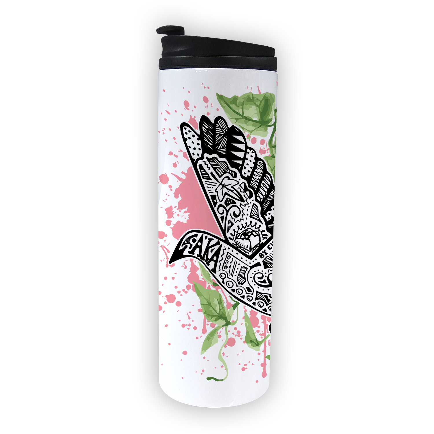 Specs: Graphic is printed on a white 16 oz. stainless steel tumbler that has removable resilient plastic lid. Features: Your sorority tumbler fits into any standard vehicle drink holder.