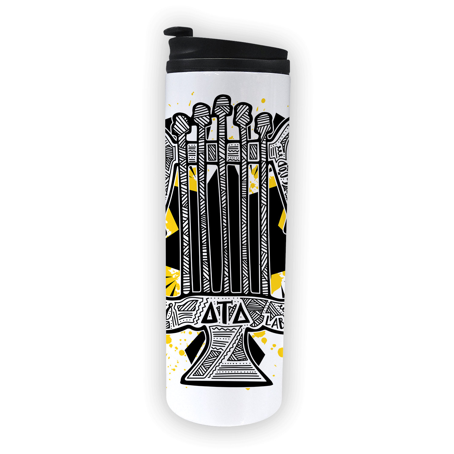 Specs: Graphic is printed on a white 16 oz. stainless steel tumbler that has removable resilient plastic lid.