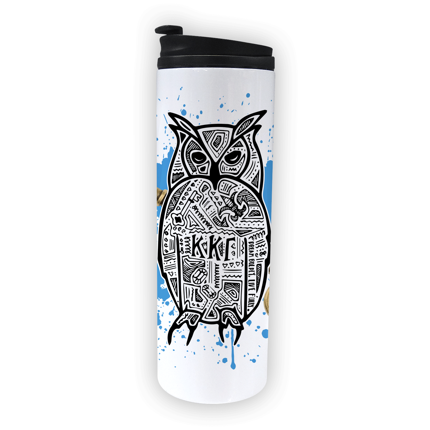 Specs: Graphic is printed on a white 16 oz. stainless steel tumbler that has removable resilient plastic lid.
