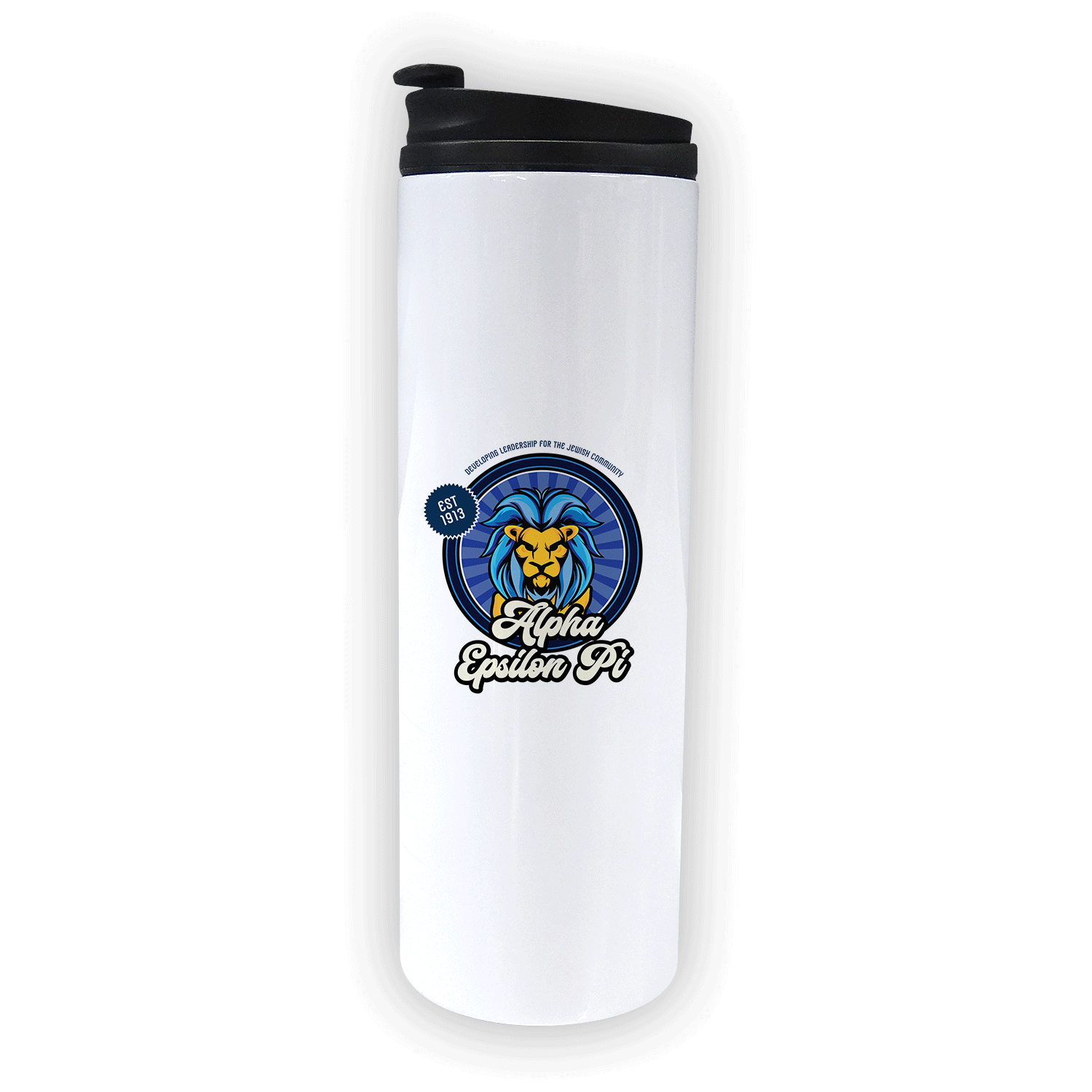 Specs: Graphic is printed on a white 16 oz. stainless steel tumbler that has removable resilient plastic lid.