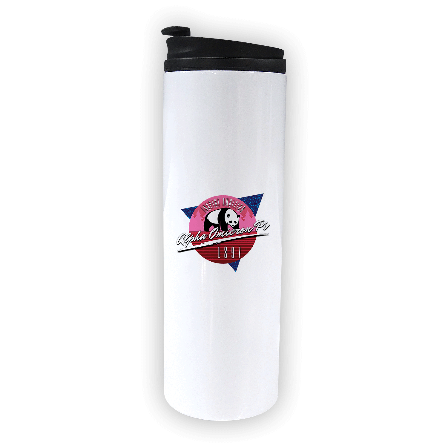 Specs: Graphic is printed on a white 16 oz. stainless steel tumbler that has removable resilient plastic lid.